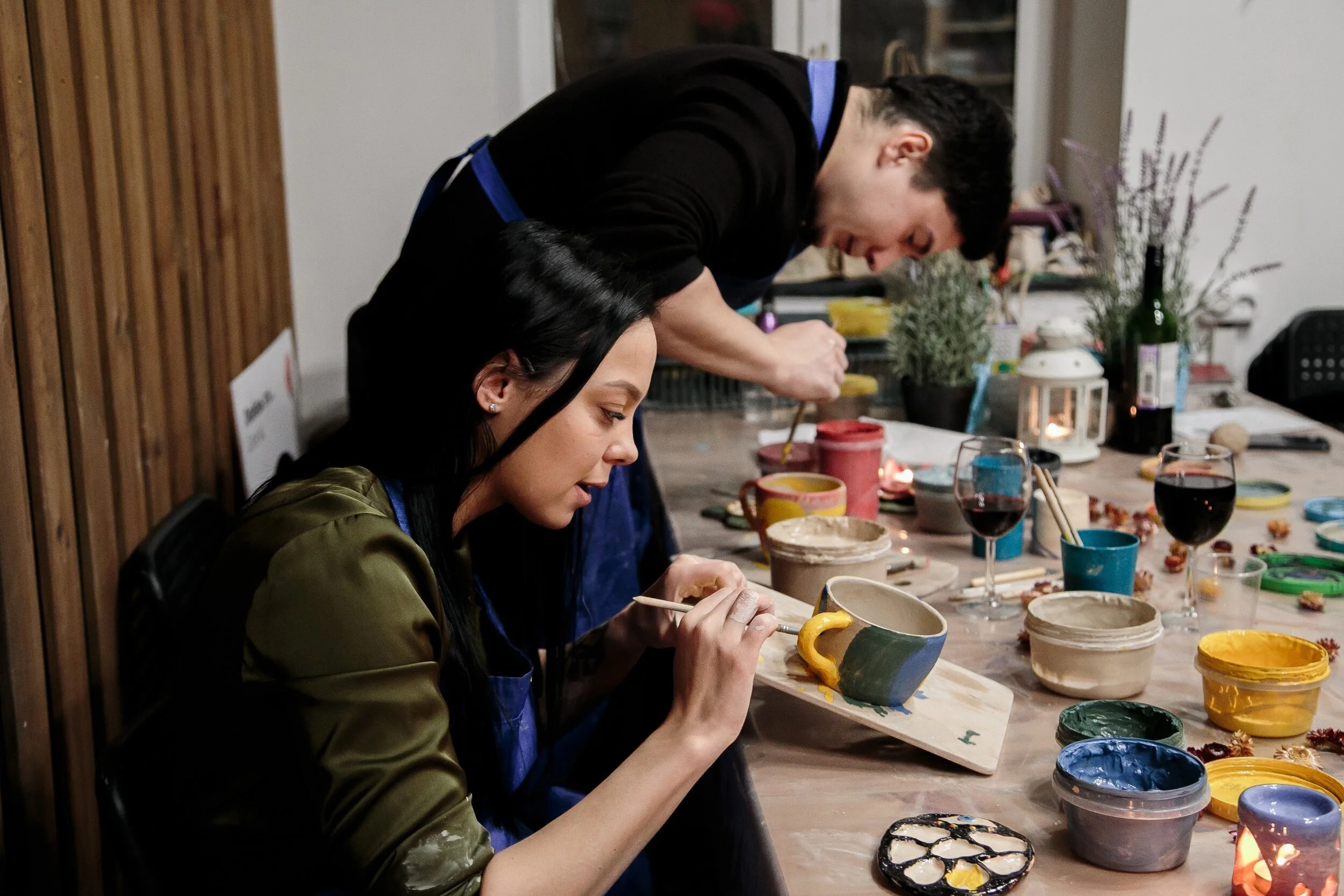 A lesson in pottery, hand-building and painting with an instructor.